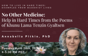 Online Tuesday April 28th - 4:00 to 5:30 Join Annabella Pitkin from our sister organization, Mangalam Centers in Berkeley for an inspiring poetry reading "Help in Hard Times from the Poems of Khunu Lama Tenzin Gyaltsen" From Mangalam: How can we transform hard times into a practice of spiritual generosity? The Himalayan Buddhist renunciant Khunu […]